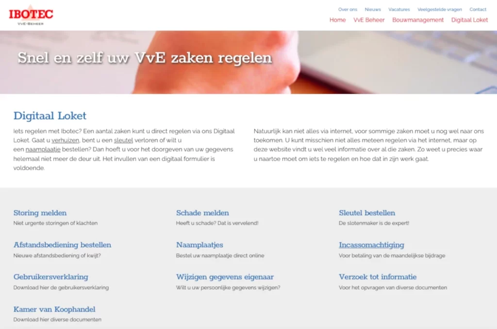 Het doel is efficient en eenvoudig meldingen en verzoeken indienen bij de gebouw beheerder. U kunt bij het digitale loket van Ibotec terecht voor allerhande meldingen en verzoeken betreffende gebouw en onderhoud: Storing melden, Schade melden, Sleutel bestellen, Afstandbediening bestellen, Naamplaatjes, Incassomachtiging, Gebruikersverklaring, Wijzigen Eigenaargegevens, Verzoek tot informatie, Kamer van Koophandel.